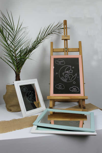 Après mettre inspirée de l’intérieur d’une boutique, je propose différents cadres et je réalise un miroir personnalisé avec le logo et le slogan de la boutique.