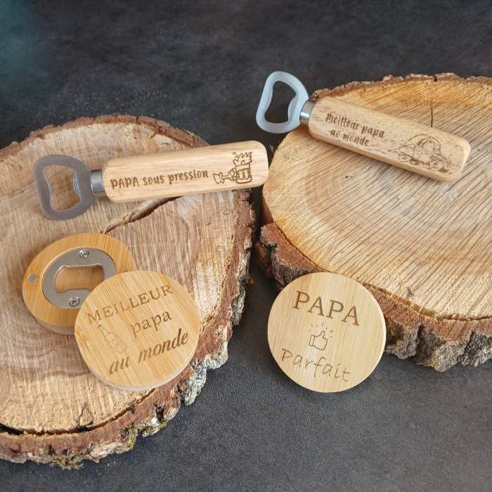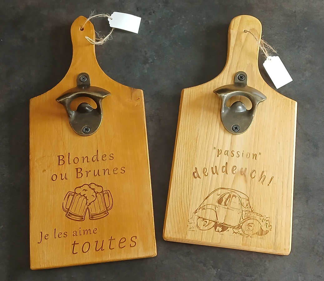 Décapsuleur en acier et bois avec gravure personnalisée sur le manche.