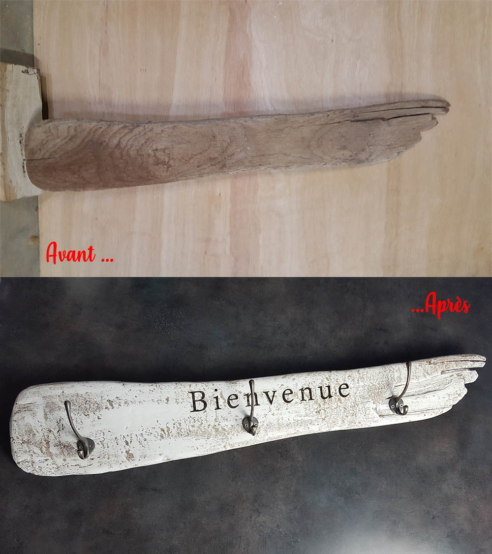 Porte manteau réalisé en bois flotté,3 crochets et gravure. Dimensions : 90 cm