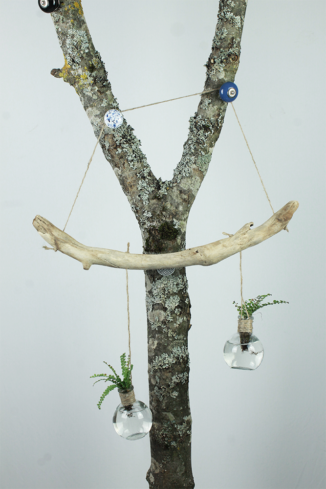 Suspension végétale en bois flotté, avec 2 pots accrochés par ficelle. Dimension :50cm
