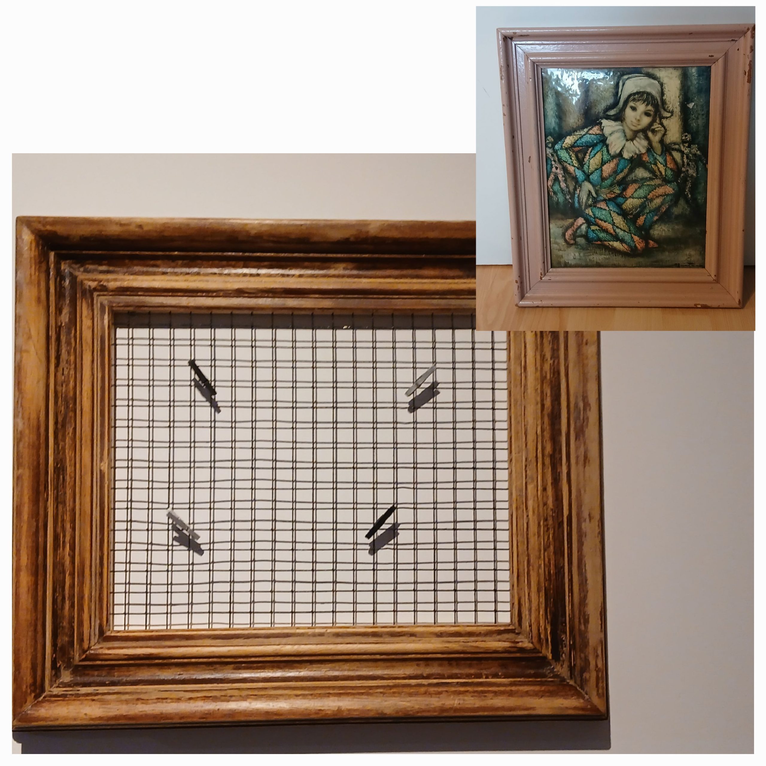 Nouvelle vie à un cadre en le détournant en pêle-mêle aspect bois vieilli. Dimension : 37cm x31 cm.