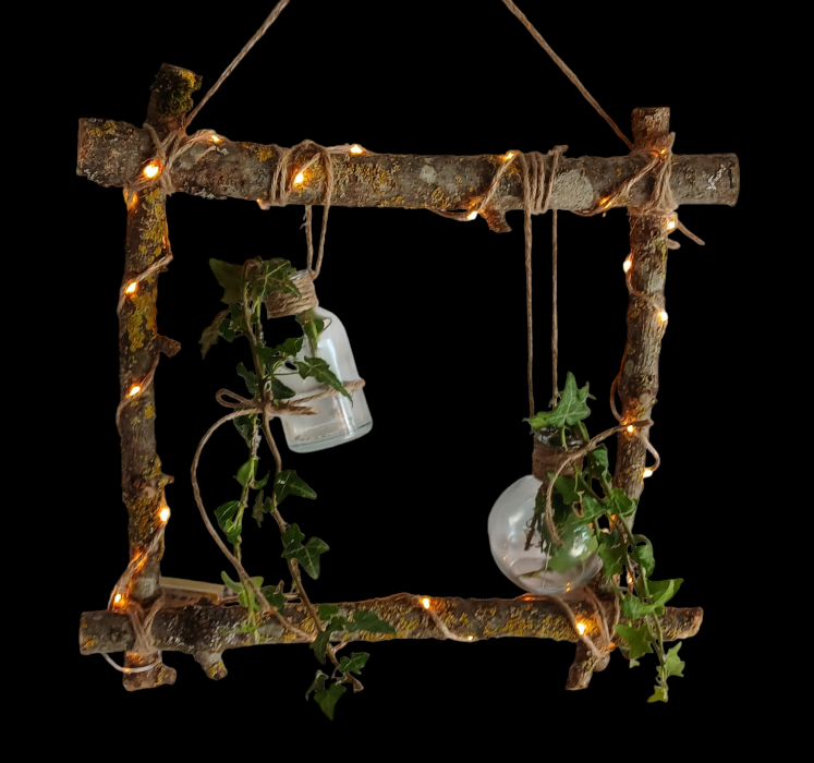 Cadre végétal lumineux, comprenant 2 pots suspendus. Fonctionne à piles ( fournies ) Dimension: 40 cm x 40 cm