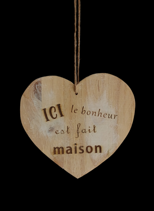Suspension en bois cérusé blanc en forme de coeur, avec gravure.