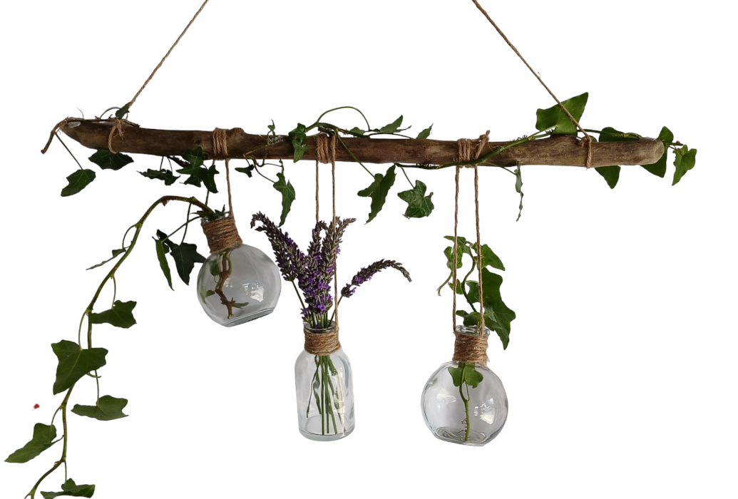 Suspension en bois flotté, décoré avec du lierre accompagné de 3 pots suspendus.