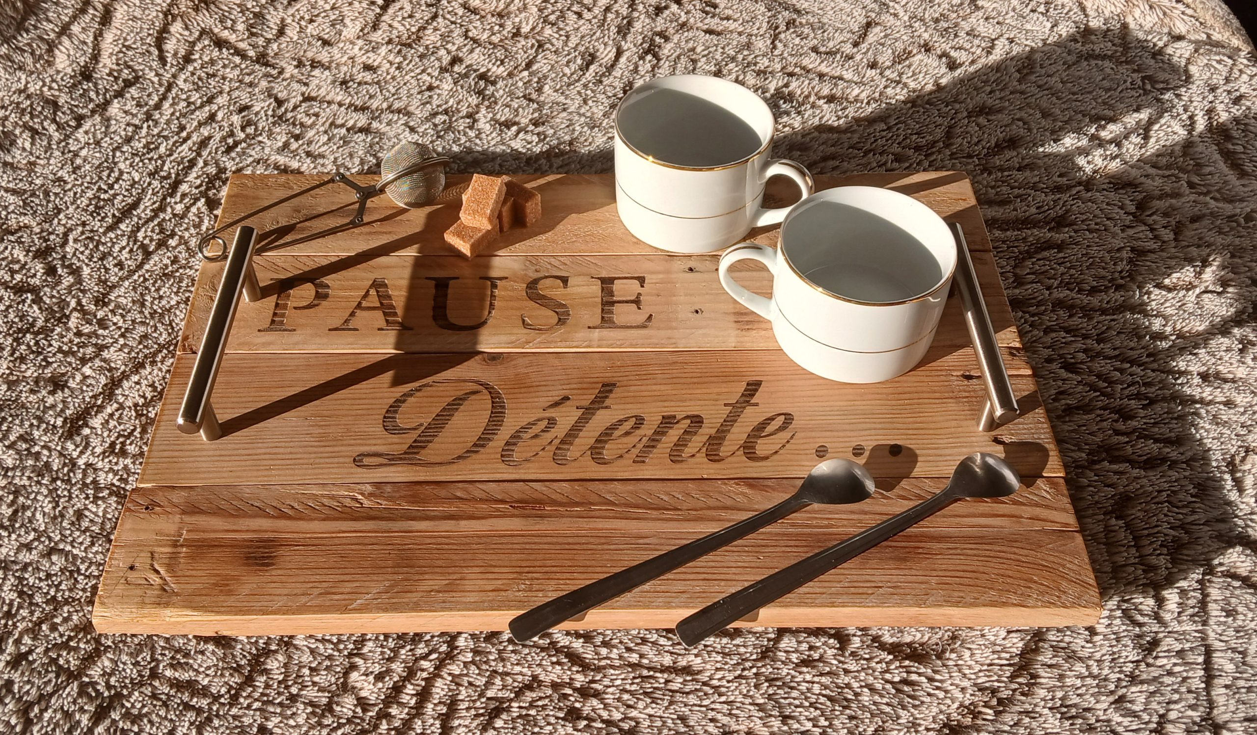 Plateau réalisé en palette. Gravure "pause détente". Dimension : 30 cm x 45 cm