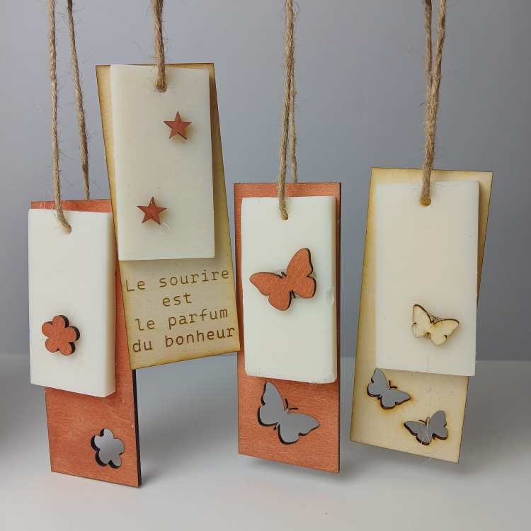 Pour parfumer armoire, salle de bain... suspension en bois avec rectangle de cire senteur boisé