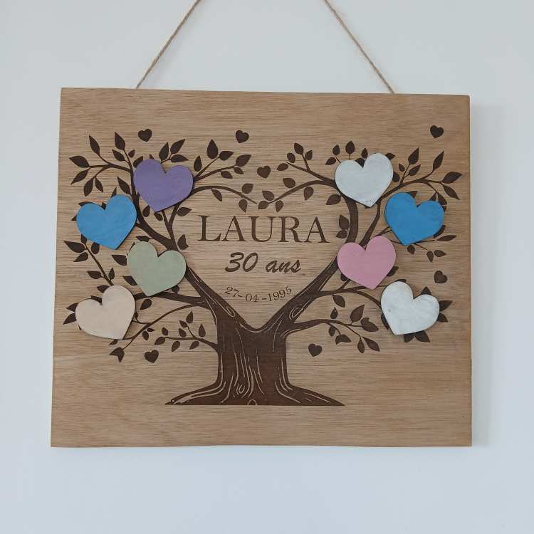 Panneau de bois gravé avec arbre de vie. Cœurs pouvant être gravés. Dimension : 30 x 20 cm